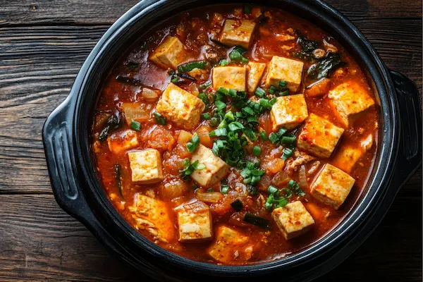 Sundubu Jjigae to klasyka koreańskiej kuchni, tradycyjnie serwowana w małych kamiennych garnkach, dzięki którym zupa pozostaje gorąca przez długi czas. W Korei to danie jest często jedzone na rozgrzewkę w chłodne dni albo po pikantnym kimchi. Ciekawostką jest, że głównym bohaterem zupy jest bardzo miękkie tofu, które w garnku praktycznie „topnieje”, nadając zupie kremową konsystencję.