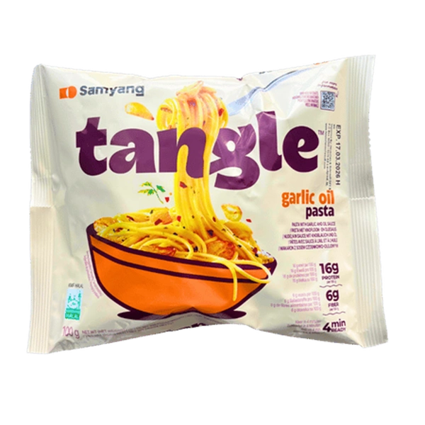 Samyang Tangle z oliwą z oliwek i czosnkiem to koreański makaron instant z wyrazistym smakiem i kremową konsystencją. Danie łączy miękki, sprężysty makaron z intensywnym aromatem czosnku i łagodną nutą oliwy z oliwek.