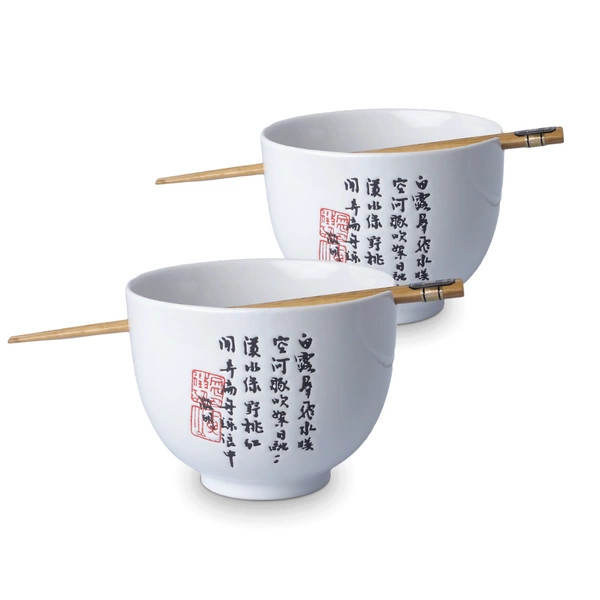 Zestaw pięknych miseczek z pałeczkami to propozycja idealna dla azjatyckich smakoszy! Dla Ciebie i bliskiej Ci osoby stworzyliśmy zestaw miseczek, w których zaserwujesz orientalne danie na bazie makaronu, ryżu czy rozgrzewającą, azjatycką zupę. Do każdej miseczki dołączone są drewniane pałeczki, które możesz wygodnie odłożyć na specjalnie przygotowanym wgłębieniu. Kupując zestaw miseczek otrzymasz dwie białe miseczki z oryginalnym motywem chińskich znaków.